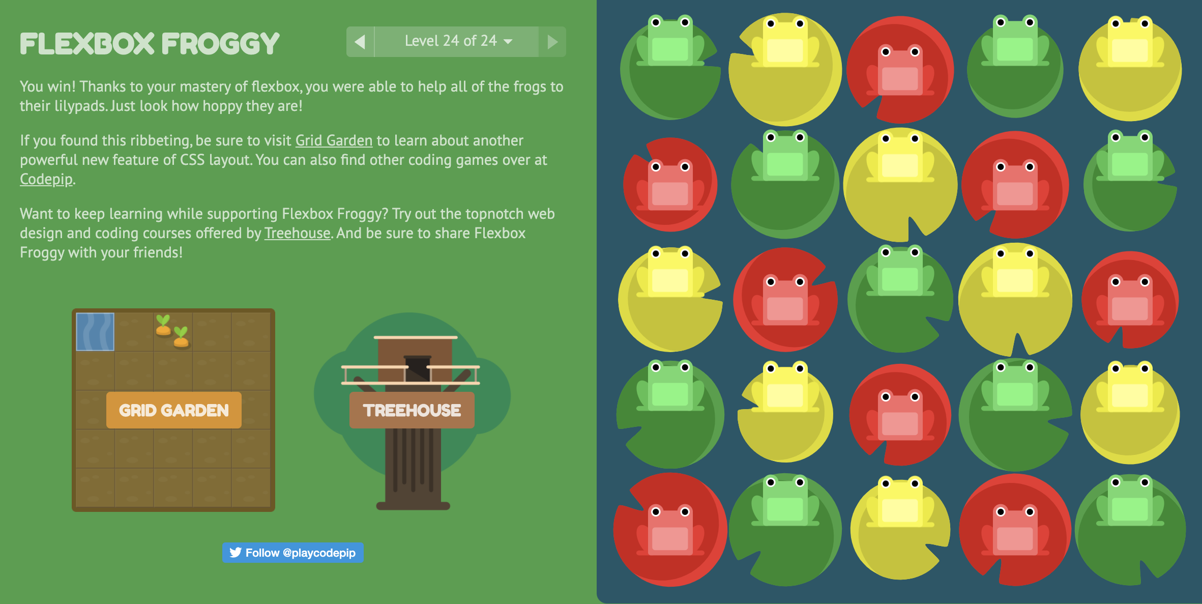 Flexbox Froggy is a fun and interactive way to practice flexbox css selectors. There are 24 levels available to play through.